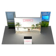 10x20 Backlit display package with one 10' center light box, two 4.5'w side light boxes, and curtains to create a storage area/changing area behind the center light box. Kit includes one shelving module with three shelves, one monitor mount, and one graphic wrap to convert one of the shipping cases into a counter