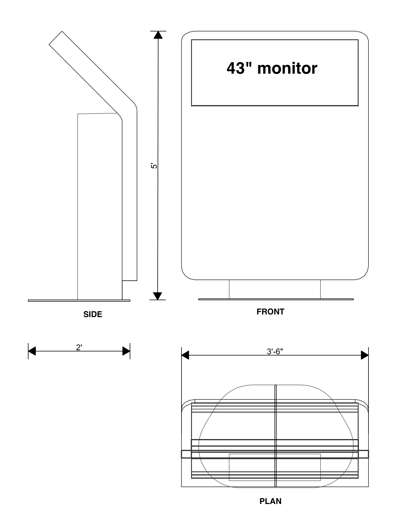 Kiosk base cabinet, cooling fan mounted in cabinet, interactive 43" touch screen, shipping crate (mini computer optional or use your own cpu or laptop)